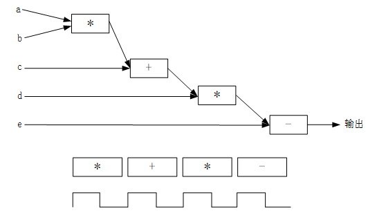 代码8.2 如果设计要求不太关心上述算法所耗费的时间(设计延迟),则可以采用如图8.1.6所示的调度策略。即第一个时钟节拍实现a×b,第二个时钟节拍实现实现c+t1,第三个时钟节拍实现实现d×t2,第四个时钟节拍实现实现t3–e。总共花费4个时钟的时间,每个节拍对应的计算结果都采用触发器锁存输出,该调度方法对于所使用器件逻辑资源延迟的要求也最低。复制代码void foo{……t1 = a * b;t2 = c + t1;t3 = d * t2;out = t3 – e;}