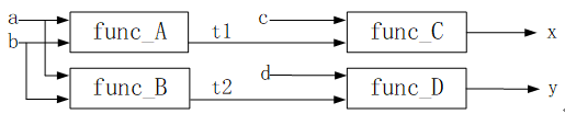 再考虑代码8.1所示的算法,如果是在传统的CPU上执行这些代码,则只能如图8.1.4所示的时序依次执行func_A、func_B、func_C、func_D,设计延迟为10个时钟周期。但考虑各个函数模块之间的依赖关系是:只有完成func_A才能得到t1,才能执行func_C;只有完成func_B才能得到t2,以执行func_D。而func_A/func_C与func_B/func_D之间并没有制约关系,如图8.1.9所示。