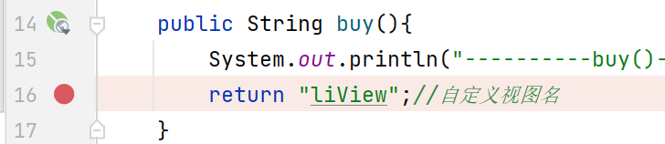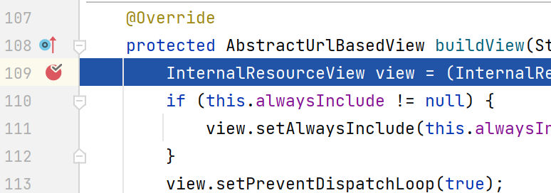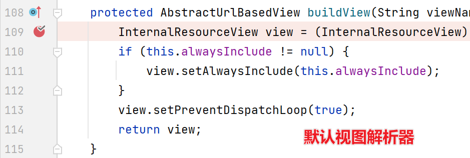 (4)点击resume,可以看到光标先跳到了默认视图解析器的 buildView 方法中:因为默认解析器的优先级在之前设置为最高。