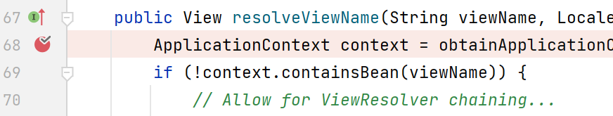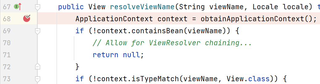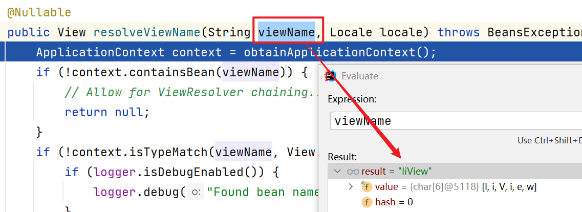 (6)点击step over,光标跳转到中央控制器的 resolveViewName 方法中: