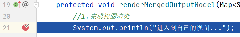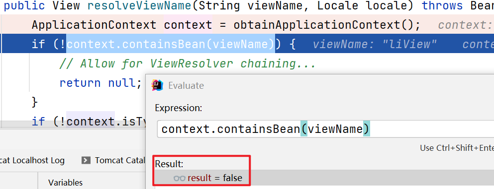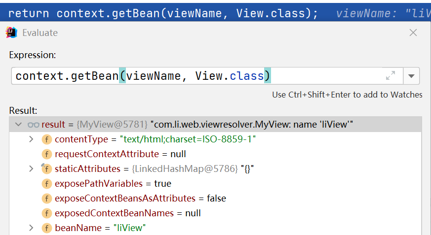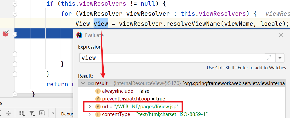 (7)在该方法中打上断点,点击 resume,可以看到此时 view 是由默认的视图解析器返回的视图对象,走的是默认机制。