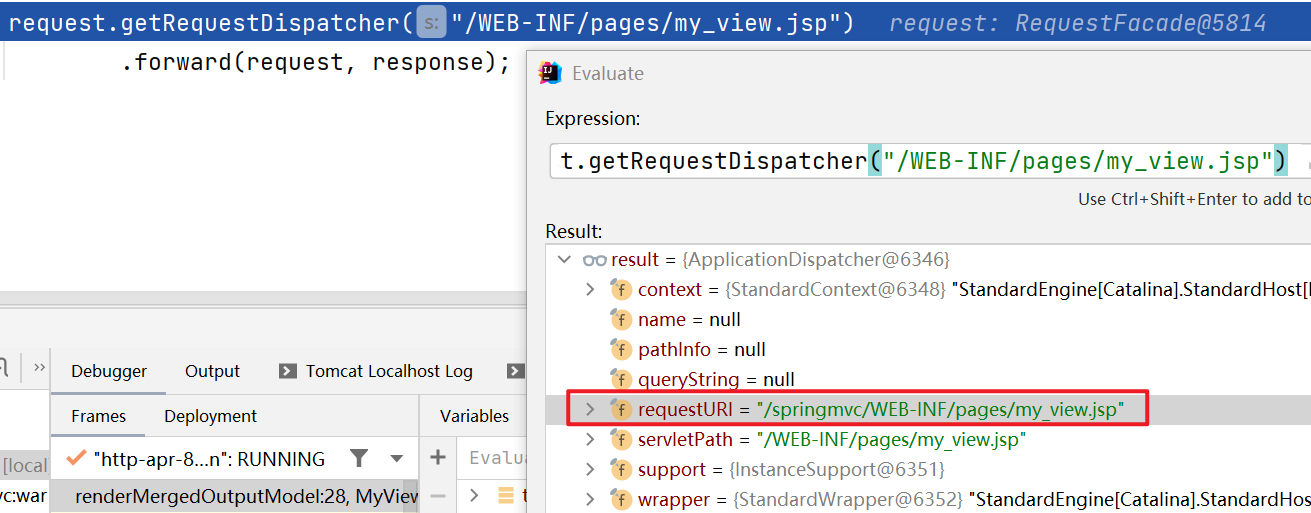 (6)点击 resume,光标跳转到该断点:在这里完成视图渲染,并转发到结果页面