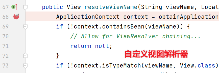 (3)在自定义的视图解析器 BeanNameViewResolver 中打上断点: