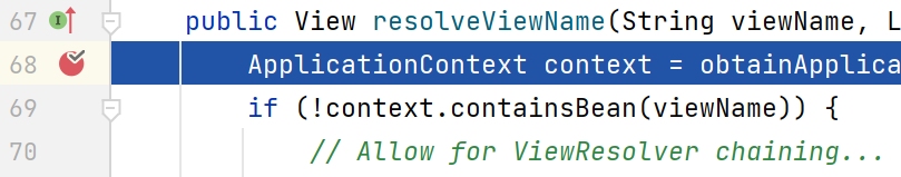 (3)分别在默认视图解析器(InternalResourceViewResolver)和自定义视图解析器(BeanNameViewResolver) 中的方法中打上断点: