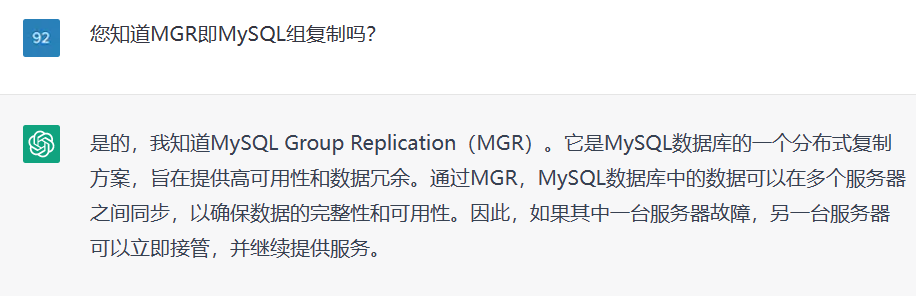 A:是的,我知道MySQL Group Replication(MGR)。它是MySQL数据库的一个分布式复制方案,旨在提供高可用性和数据冗余。通过MGR,MySQL数据库中的数据可以在多个服务器之间同步,以确保数据的完整性和可用性。因此,如果其中一台服务器故障,另一台服务器可以立即接管,并继续提供服务。