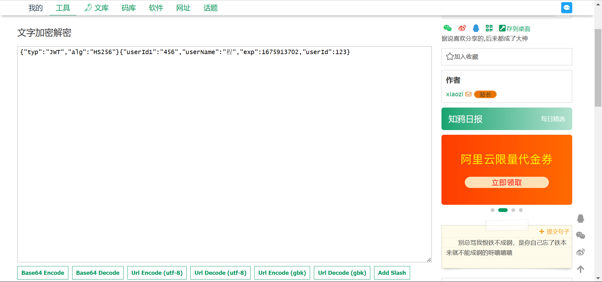 利用base64解密工具来查看生成的JWT Token中header和payLoad的明文