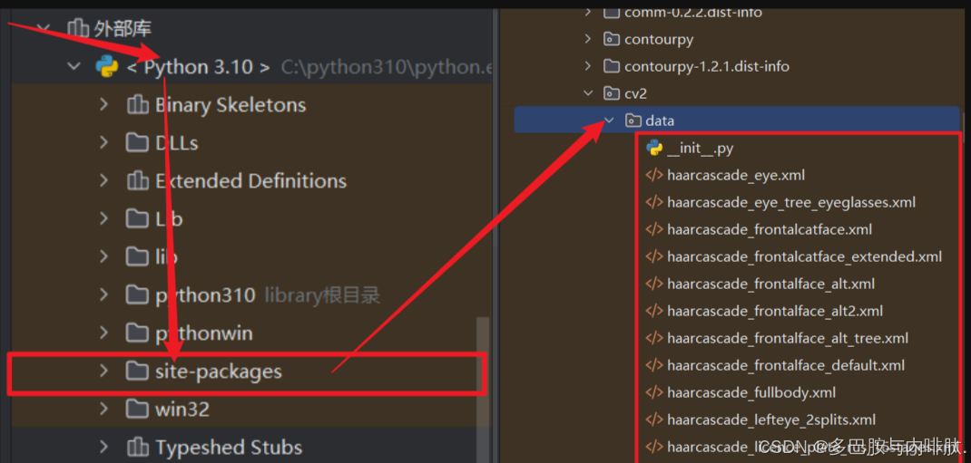 OpenCV 提供了一些练习好的级联分类器供用户利用。这些分类器可以用来检测人脸、脸部特征(眼睛、鼻子)、人类和其他物体。这些级联分类器以XML 文件的形式存放在 OpenCV 源文件的 data 目录下,因为在我们pip安装时已经下载好了,加载差异级联分类器的 XML 文件就可以实现对差异对象的检测。