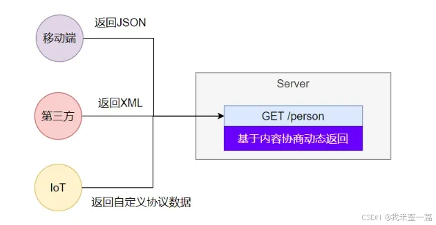 客户端向服务端发送请求,携带HTTP标准的Accept请求头。Accept: application/json、text/xml、text/yaml,服务端根据客户端请求头盼望的数据范例进行动态返回