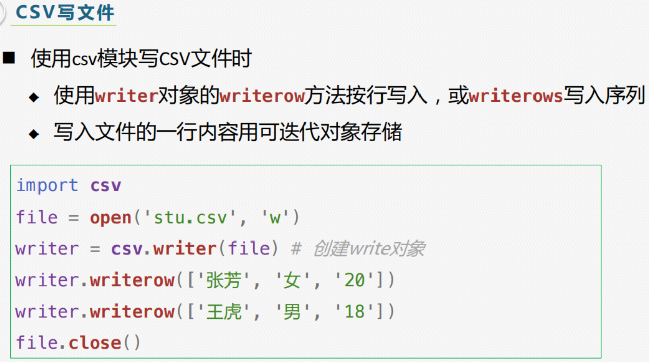 - # 注意写入的是1个可迭代对象,所以可以是1个列表,而每一个被迭代的元素是csv中的一行,所以也可以是一个列表