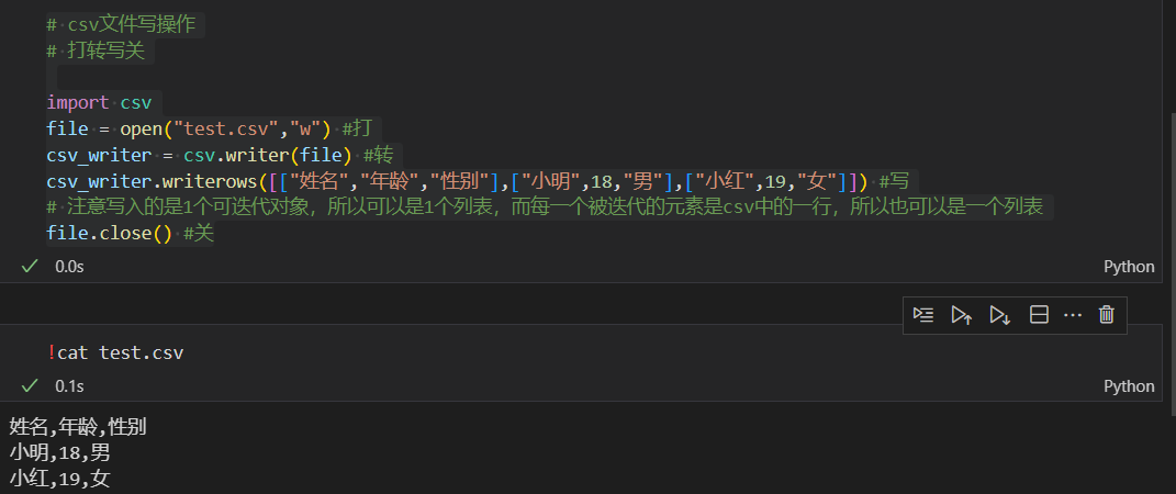 同样的,我们写单个字符用writerow,假如是写入一个可迭代对象就writerows