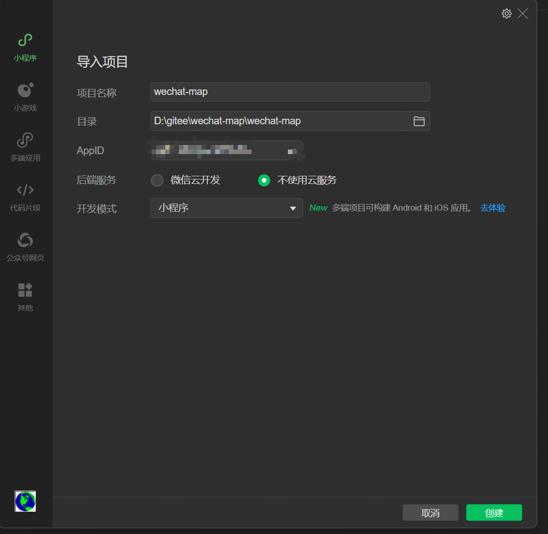 一、申请微信小程序,填写相应的信息,取得开发者ID。这个要给腾讯舆图使用的。