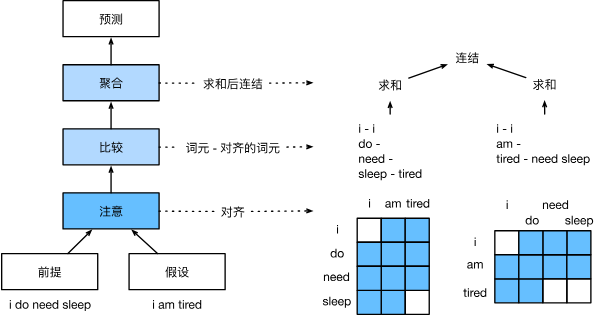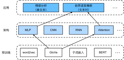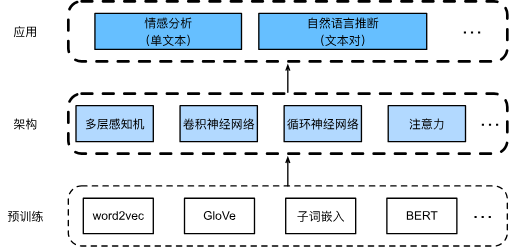 具体来说如图所示,我们将在这一章设计差别的深度学习架构实现两种应用,比如对于感情分类利用卷积神经网络和循环神经网络架构,对于自然语言推断利用多层感知机和留意力机制架构。