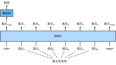 复制代码 这里演示了整个模子的过程:首先BERT中的encoder将文本转化为向量表现,接着取文本的开头<cls>的词表式放入多层感知机用于分类。