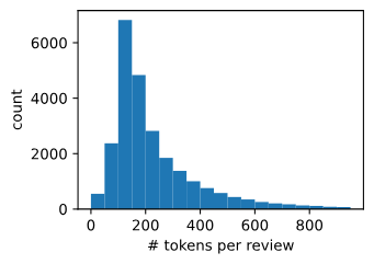 复制代码 为了确定最大长度,我们查看评论长度直方图:- d2l.set_figsize()