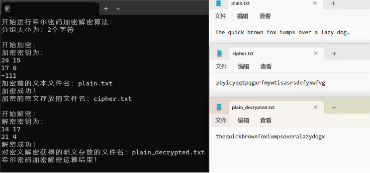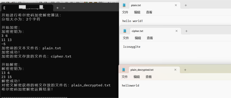 在此次实验中,直接在仿射暗码的代码上举行修改,就简单很多,只需要将差别的地方举行修改即可,如最大公因式函数、求逆元函数、以及文件打开等部分都保持不变,但在随机天生函数部分,由一个改成一个矩阵,然后就是分组举行加密解密部分举行修改。