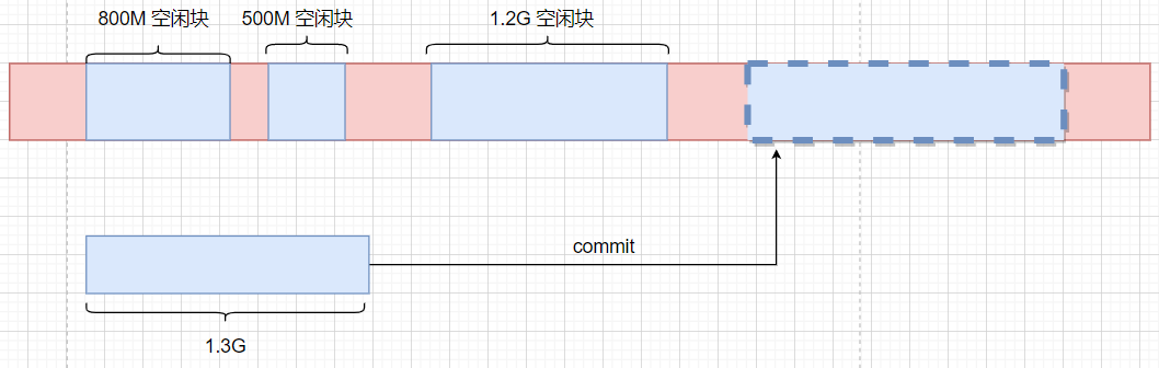 从图中看,程序要分配 1.3G 的对象, 虽然 LOH 上有 2G 的空闲空间但就是放不下,无奈只能 commit 更多的内存来存放这个对象。