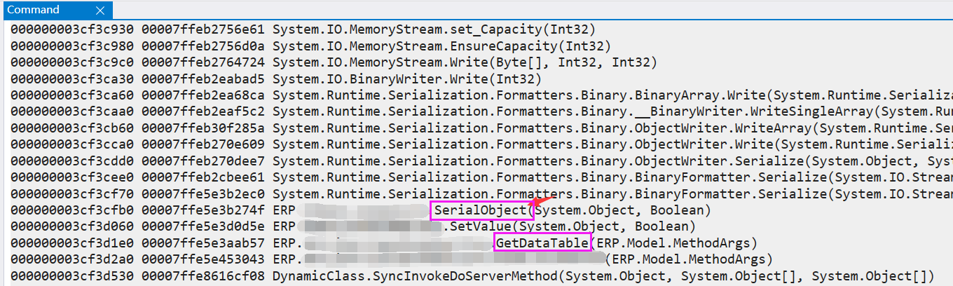 复制代码 从 unicode 码来看,貌似是一个 DataTable 的序列化,看样子是序列化一个巨大的 DataTable 导致的内存暴涨,接下来我们到线程栈上找到有么有类似的操作,算是碰碰运气吧。