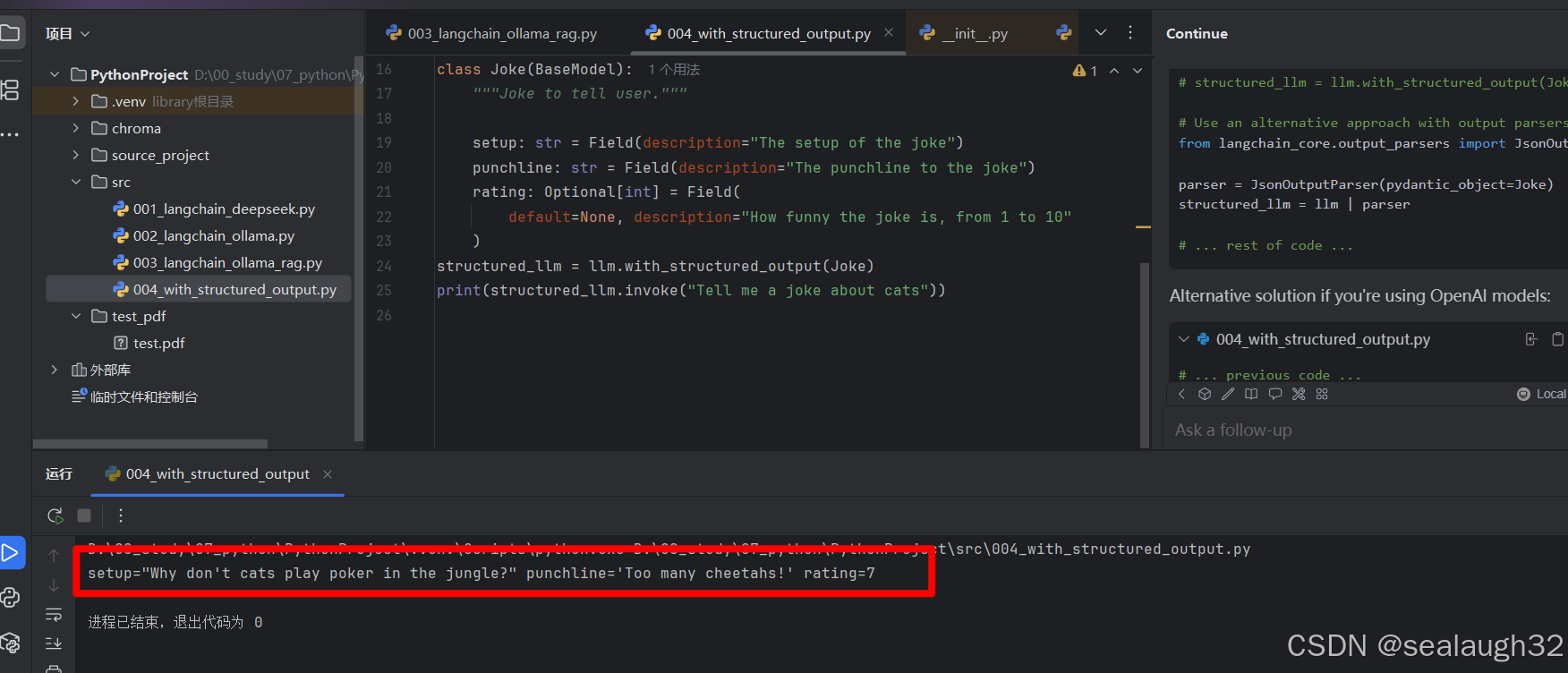 - 需要引入langchain-deepseek这个包,可以看出langchain开始对于deepseek支持了。