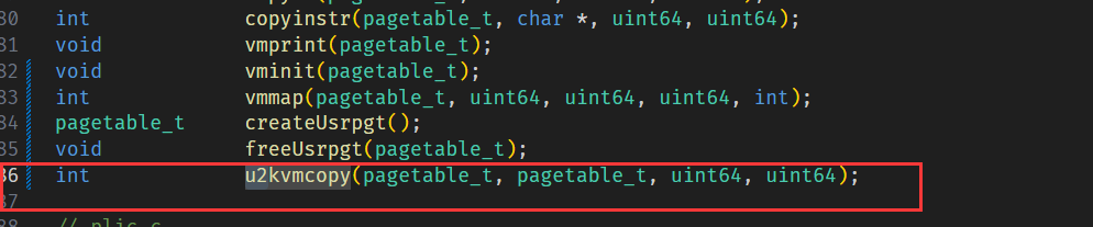 添加函数 u2kvmcopy 声明,该函数负责拷贝用户页表到用户内核页表: