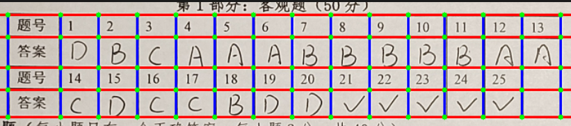 上图展示了表格网格识别的结果,蓝色线条表现竖线,红色线条表现水平线,绿色点表现线条交点。