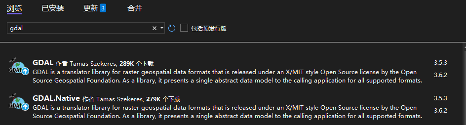 C#使用GDAL库需安装以下两个Nuget包:GDAL和GDAL.Native