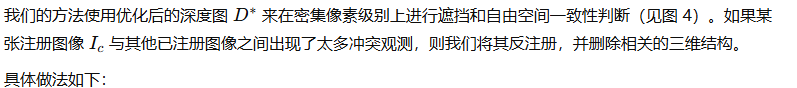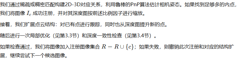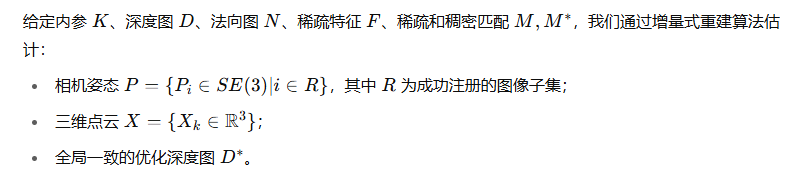 我们通过提升低视差的内点并对别的点三角化来构建初始点云,然后用以下公式对每张图像的深度图进行尺度对齐: