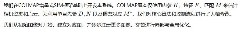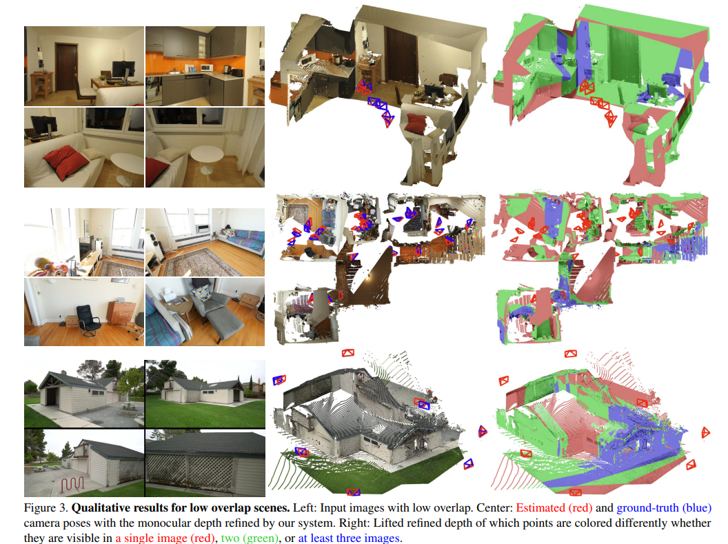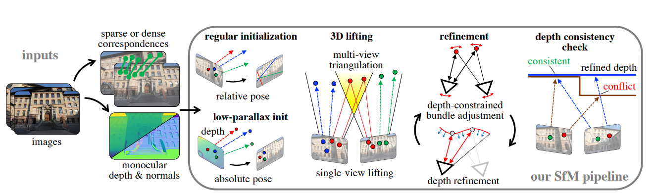 本文提出了一种基于单目深度估计的方案,用以解决这些剩余的关键困难。我们将单目深度与法向信息引入传统的增量式SfM流程中,从而不再依靠三视图轨迹,仅通过两视图即可实现准确的三维重建。这使得体系在低重叠场景中依然具有强大