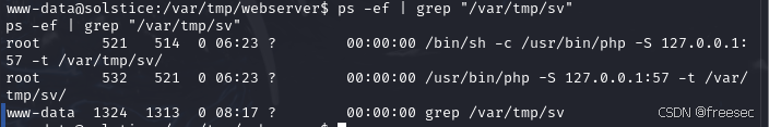 发现有一个进程利用php解释器实行/var/tmp/sv,利用ehco写入木马构造恶意php文件