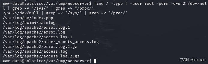 find / -type f -user root -perm -o=w 2>/dev/null | grep -v "/sys/" | grep -v "/proc/"