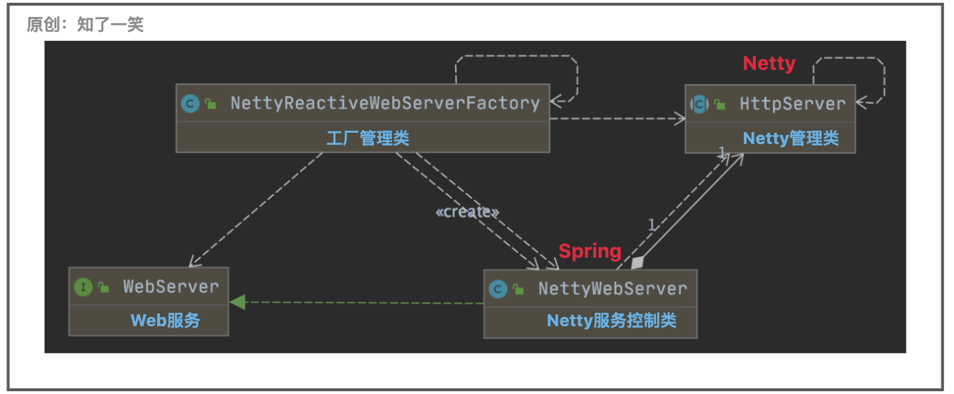 Gateway项目中,Netty服务核心控制类,通过NettyReactiveWebServerFactory工厂类创建,对Netty生命周期的管理提供了一层包装;- public class NettyWebServer implements WebServer {