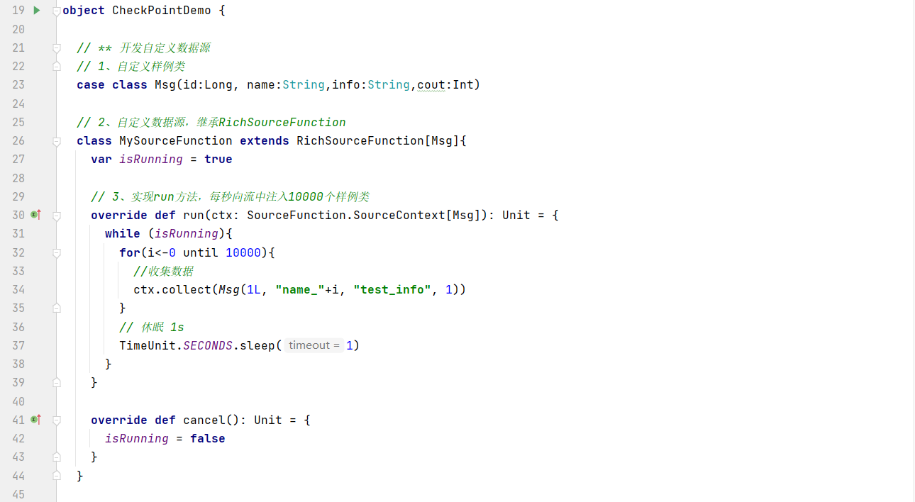 [code]// ** 开发自定义数据源// 1、自定义样例类case class Msg(id:Long, name:String,info:String,cout:Int)// 2、自定义数据源,继承RichSourceFunctionclass MySourceFunction extends RichSourceFunction[Msg]{ var isRunning = true // 3、实现run方法,每秒向流中注入10000个样例类 override def run(ctx: SourceFunction.SourceContext[Msg]): Unit = { while (isRunning){ for(i