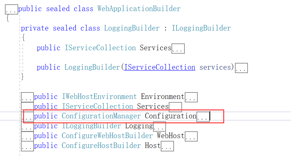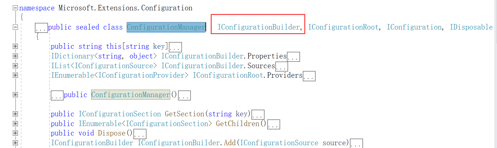 查看 Configuration 属性,可以看到是 ConfigurationManager 类型,而 ConfigurationManager 实现了 IConfigurationBuilder 接口。