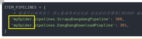 - 'mySpider.pipelines.ScrapyDangdangPipeline': 300,