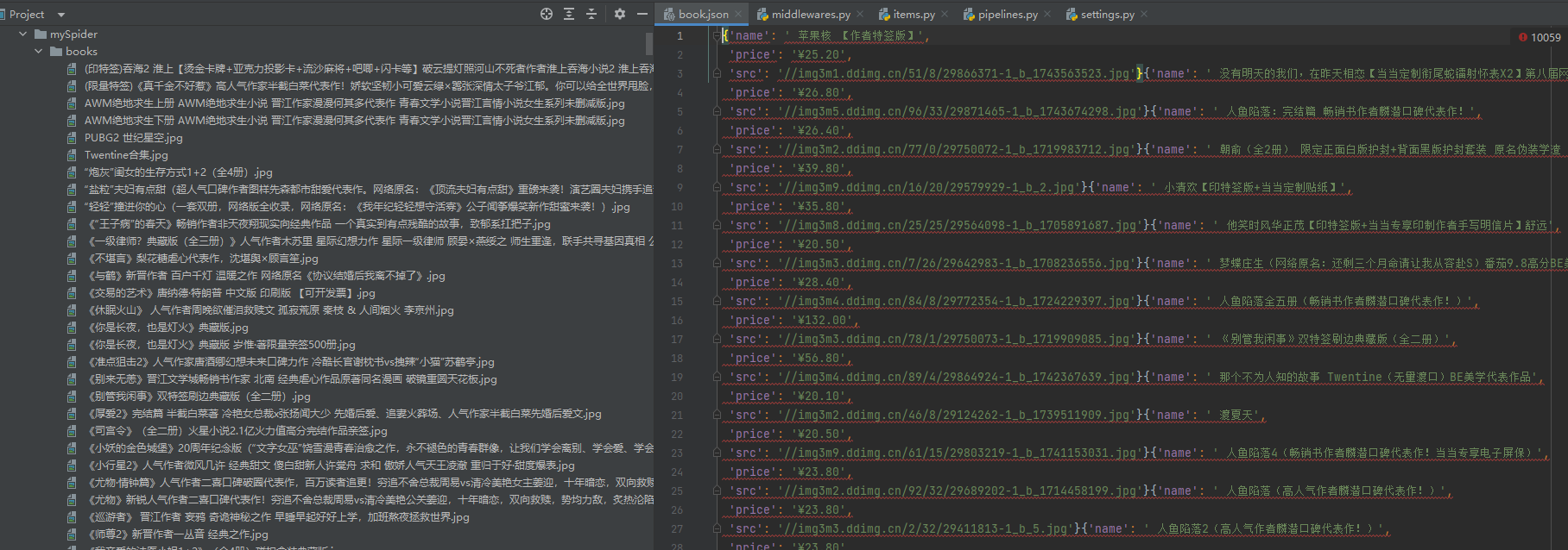 - book = MyspiderItem(src=src,name=name,price=price)
