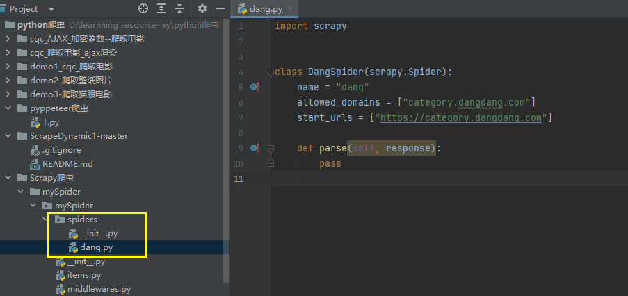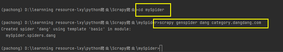 创建好文件夹之后,通过cd mySprider进入到文件夹内部,创建通过scrapy genspider 爬虫步调了,这里创建爬虫文件,scrapy genspider dang category.dangdang.com
