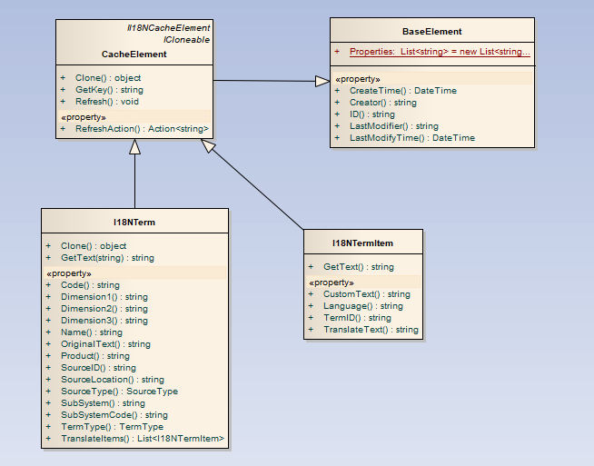 复制代码 一条词条,包含多个词条子项I18NTermItem,每一个词条子项,都代表了一种语言的翻译结果- public class I18NTermItem : CacheElement