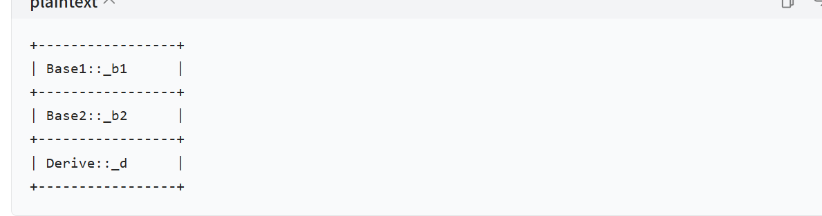 在多继续的环境下,派生类对象的内存布局是按照基类在派生类界说中出现的次序依次分列的,接着是派生类自身的成员。以 Derive 类为例,它先包罗 Base1 的成员,然后是 Base2 的成员,末了是 Derive 自身的成员。内存布局如下: