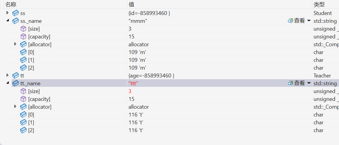 我们也可以通过调试看出来,确实此时Teacher和Student的_name都是同一个_name了,这只限于自己的派生类继续时如许,创建Student和Teacher对象的时间照旧都是独立的_name。