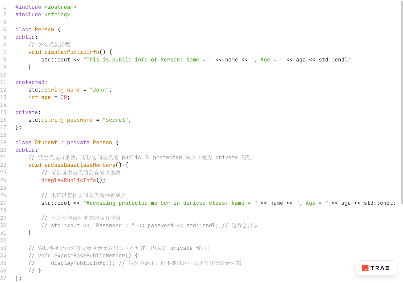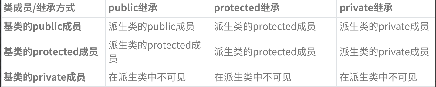 3. 实际上⾯的表格我们进⾏⼀下总结会发现,基类的私有成员在派⽣类都是不可⻅。基类的其他成员 在派⽣类的访问⽅式 == Min(成员在基类的访问限定符,继续⽅式),public > protected >