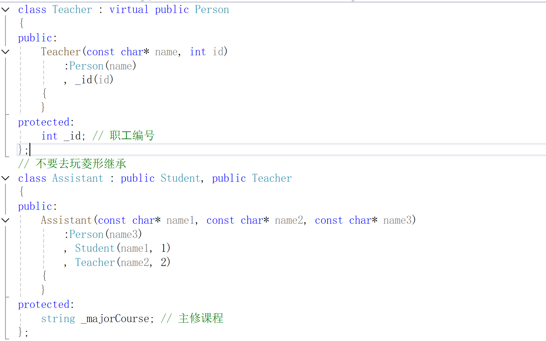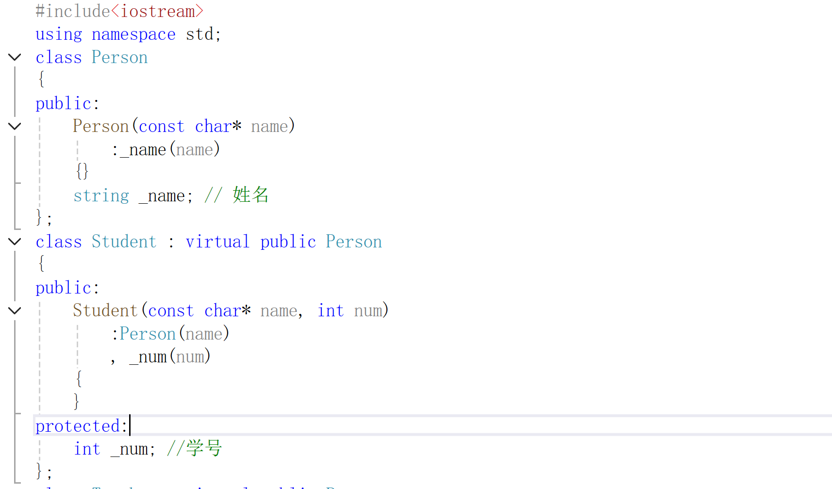 我们知道是Student和Teacher都继续了Person导致的,只须要在这两个类的继续前面加上virtual即可。