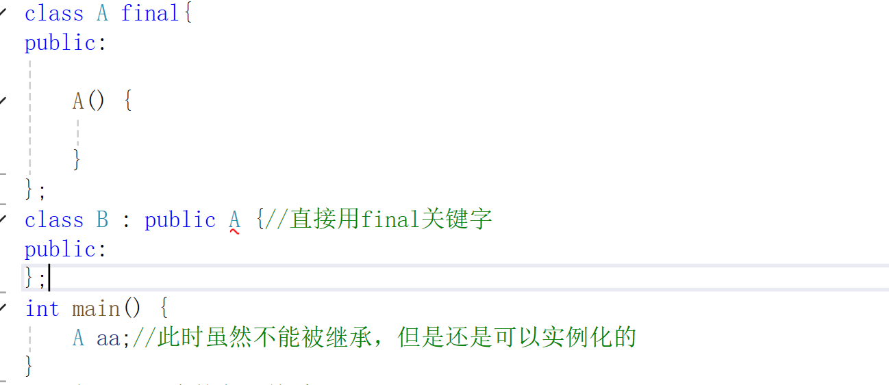 利用final关键字,此时就不能被继续,但是不影响A的默认构造。