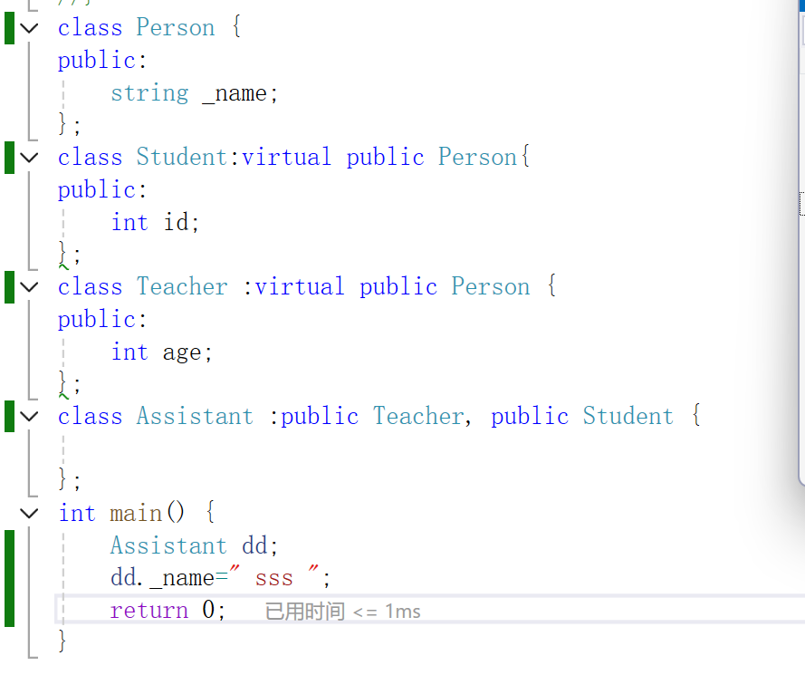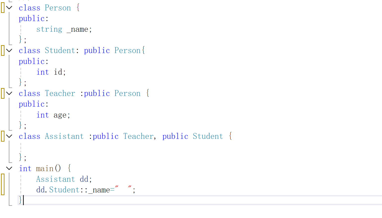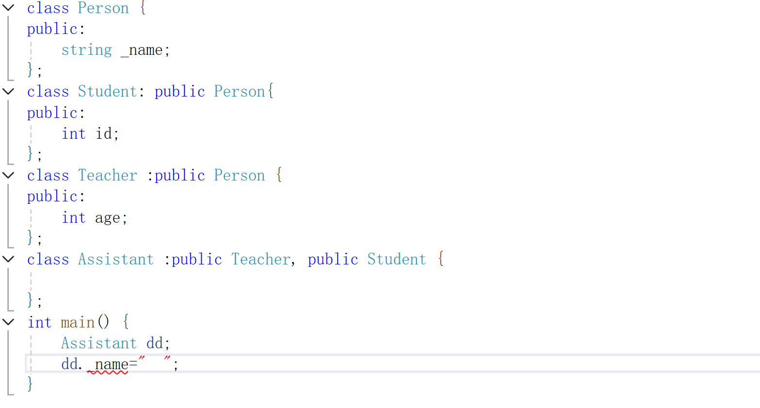 这就是菱形继续,二义性就是,我们的Student和Teacher都继续了Person的_name变量,导致,我们实例化Assistance的时间,访问_name此时就会堕落了,不知道访问的是Student的照旧Teacher的,此时就出现了二义性,就须要指定类域的方式办理了。