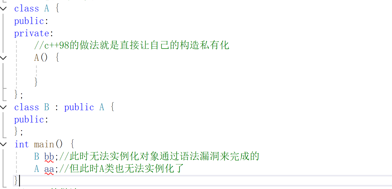 我们可以看一下,就是利用了一个语法毛病,把父类的友元函数弄成私有的,此时调用不到,就会无法实例化对象,但是也有缺陷,此时A也无法利用默认构造了。