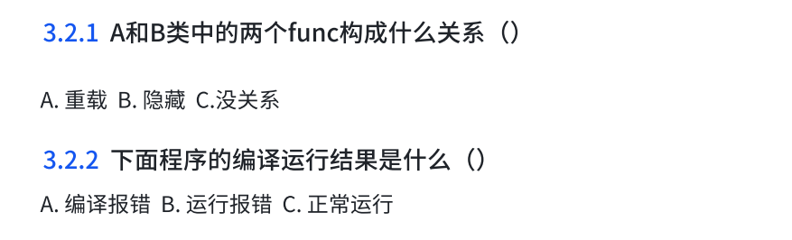 假如没有上面那句话的提示,大概许多多少人都会选A C了,但是结合上面的话我们可以知道,只要名字类似就是隐蔽和参数没关系,他不会构成重载,而是隐蔽,此时也会编译报错,A类的方法被隐蔽了,你调用的func函数都是B类的,你没有传参数,此时就会编译报错了。