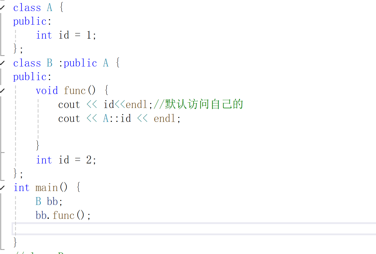 可以看A中的func函数,假如直接访问id,默认访问的是自己的,由于隐蔽规则吗,此时B的id就把A的id给覆盖了,想访问A的可以用下面的那种方法,指定作用域即可。