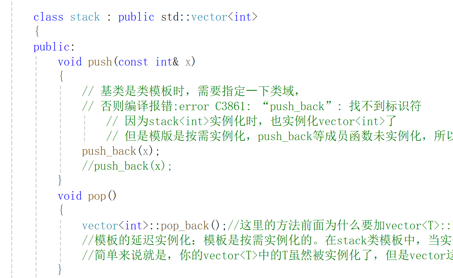 2.模板的延迟实例化:模板是按需实例化的。在stack类模板中,当实例化stack<int>时,固然也会实例化vector<int>,但vector<int>中的成员函数如push_back、pop_back等大概并没有立即被实例化。假如直接利用push_back等函数而不加vector<T>::限定,编译器在编译stack类的成员函数时大概无法找到这些函数的界说,由于它们大概还没有被实例化。而加上vector<T>::限定,编译器就可以或许明白知道要在父类std::vector<T>的作用域中查找这些函数,纵然它们还没有被实例化,也能准确地进行编译,在须要的时间再进行实例化。