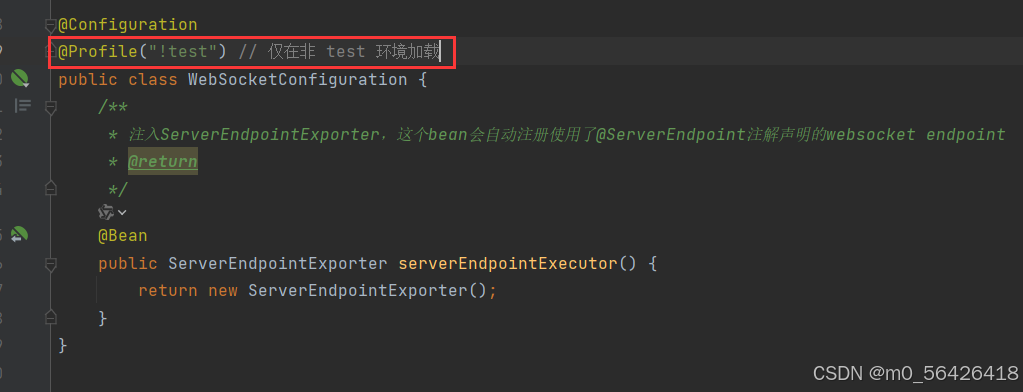 我们可以把websocket的config写成根据差别配置选择是否加载,让其判定当前是否是测试环境,如果是则不加载websocket干系业务代码: